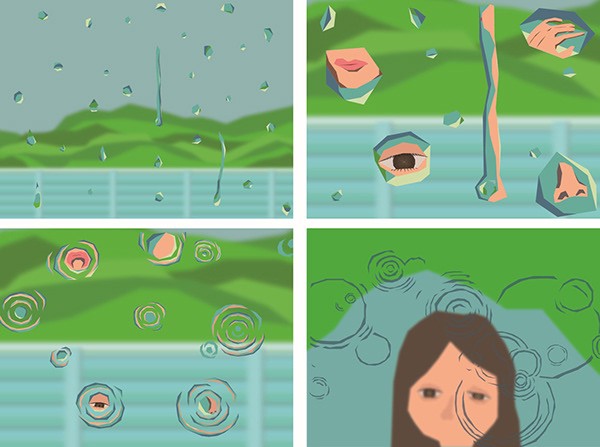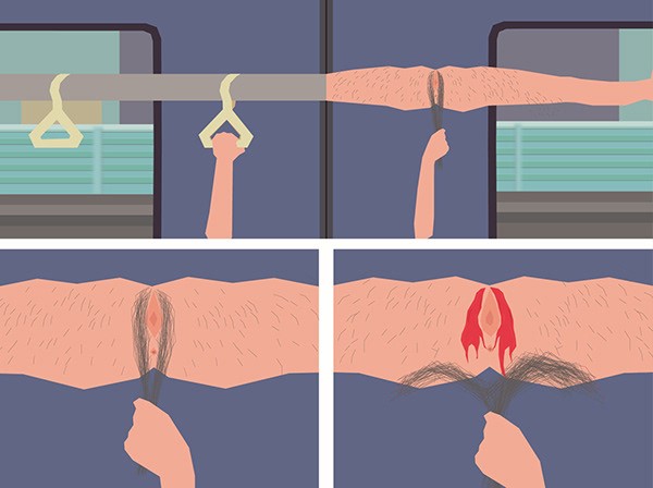 Each panel begins with an ordinary action and shifts into a form of bodily violation or self-imposed correction—