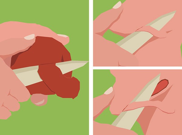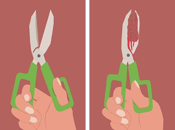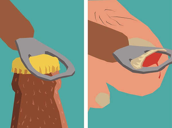 例如削蘋果變成削下巴、調整便利貼投射到牙齒、啤酒開瓶器轉而撬開指甲